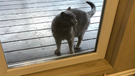 Утренняя прогулка на даче городского кота Тёмы. Нагулялся на морозе и попросился в дом.