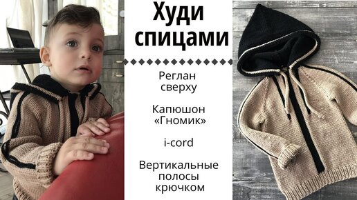 ХУДИ СПИЦАМИ || Реглан сверху, капюшон гномик, i-cord, вертикальные полосы крючком ||