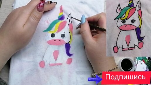 Рисунок по ткани. Акриловыми красками. Единорожка на футболке