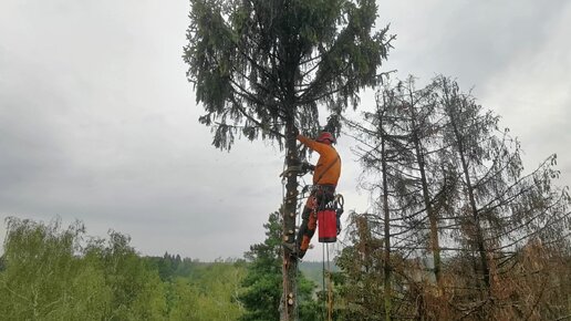 Удаление макулки короедной ёлки. Спил деревьев бензопилой. Арбористики.