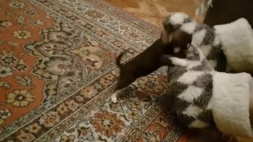 Любимый тапок. Пульке 2 месяца. Чихуахуа Пулька и шотландская кошка Буня.
