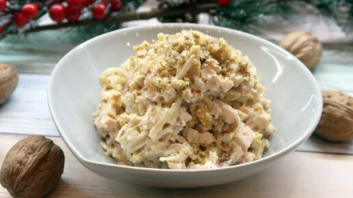 очень вкусный салат с копченой куриной грудкой, луком и грецкими орехами