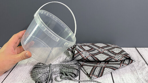 Беру пластиковое ведёрко, ткань и верёвку. И переделываю скучное ведро в красивую вещь которой найдётся применение в доме