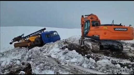Буровая установка на базе КАМАЗа, не может подняться в гору, пробуем тащить экскаватором