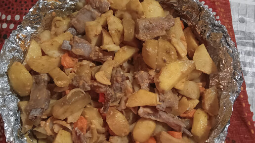 Запечённая картошка с мясом и рёбрышками в духовке.