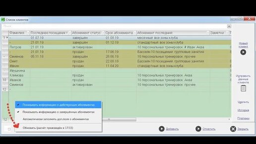 Столбцы с информацией о абонементе, сроке его действия и последнем посещении в списке клиентов