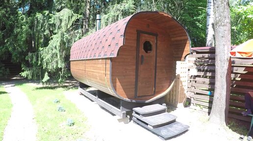 Обзор квадро бани бочки 4,5 метра на бетонных блоках с параллельными полками в парной