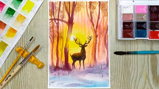 Как нарисовать лесной пейзаж с оленем акварелью, передав глубину. Акварель для начинающих.