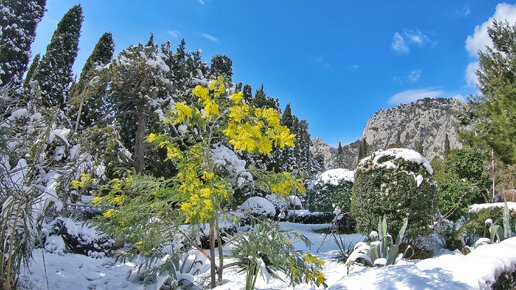 Что с погодой. Весенний снегопад в Крыму. Симеиз в снегу: Кипарисовая аллея, парк, скала Дива, пляжи