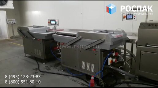 Упаковочная линия Webomatic вакуумные аппараты с автоматической разгрузкой и термоусадочным тоннелем