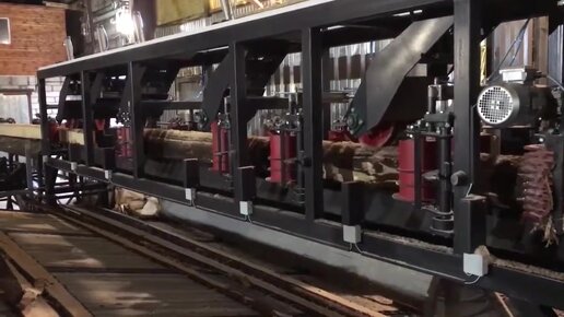 Брусовальный двухвальный станок с брусоотделителем KRAFTER. Работа станка на производстве. Обработка 4-5 бревен в минуту