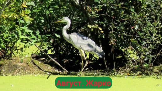 Серая цапля загорает на пруду