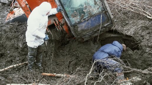 Вытаскиваем утонувший экскаватор без применения тяговой лебёдки. Часть первая.