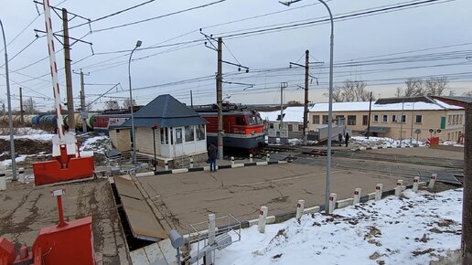 ВЛ80С проходит через переезд, а невнимательный пешеход чуть-ли не попадает под него...