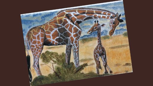 Процесс живописи жирафов акриловыми красками на бумаге.