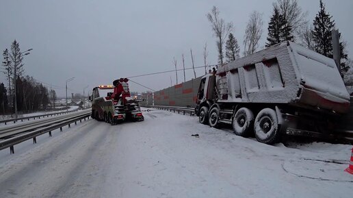 45 тонный груженый самосвал снес себе дверь и ограждение на ЦКАД