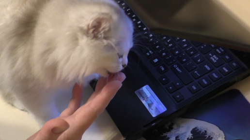 Маму нужно облизать. Мама очень вкусная. Кошечка облизывает пальцы.