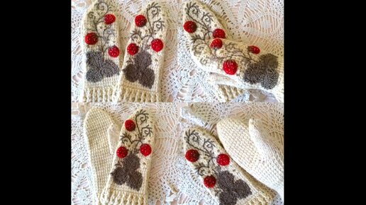 Варежки - Клубнички крючком тунисским вязанием,аппликация, вышивка.mp4