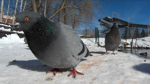 Голуби и утки на мартовском пруду