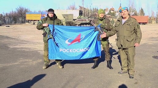Бойцы интернациональной бригады ДНР «Пятнашка» с флагом Роскосмоса