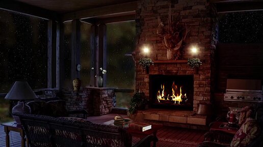 4К. РАССЛАБЛЯЮЩИЕ ЗВУКИ КАМЕННОГО КАМИНА В СОЧЕТАНИИ МЯГКОГО ДОЖДЯ.