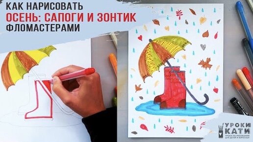 Как нарисовать осень: резинные сапоги и зонтик фломастерами, пошаговый урок для детей и взрослых