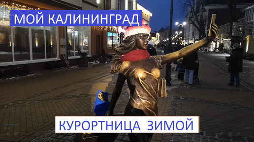 Калининград. Зеленоградск-курорт. Курортница мёрзнет на морозе. Как украшен город.