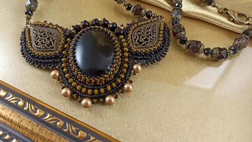 Колье авторское, вышитое бисером, с черным агатом, с бусинами Swarovski, art ko1