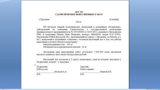 Акт сдачи-приемки выполненных работ для ИП