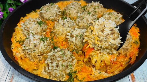 Беру фарш, рис и капусту и закладываю в сковороду: вроде бы продукты простые, а так вкусно (чем-то похоже на голубцы)