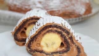 Раньше покупала его в пекарне у дома,а теперь пеку сама: муж говорит,что у меня получается вкуснее. Шоколадно-банановый рулет