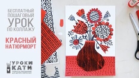 Как сделать красный натюрморт с цветами, клеим из бумаги, пошаговый урок по аппликации для детей