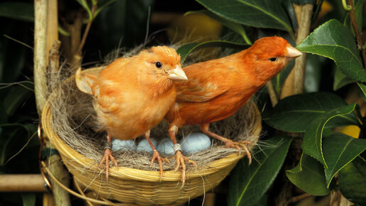 Две канарейки высиживают яйца.