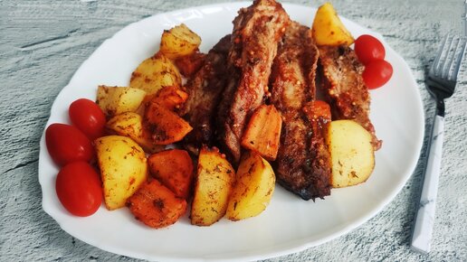 Свиные ребра с картофелем, морковью и с специями запеченные в духовке