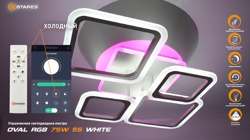 Стильная квадратная потолочная светодиодная люстра с пультом OVAL RGB 75W 5S-APP-718X500X105 корпус Белый от Estares
