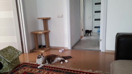 Как встречают меня коты. Мейн-кун громко орет, потерял всех. Лежат вместе.
