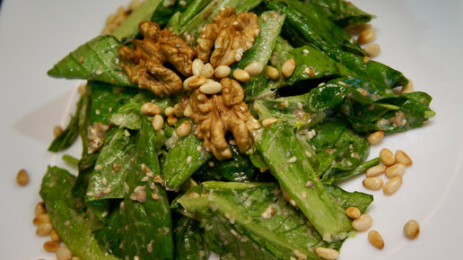 Постный салат Ромэн с ореховым с соусом и шпинатом .