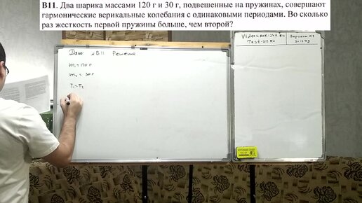 Два шарика массами 120 г и 30 г, подвешенные на пружинах, совершают гармонические вертикальные колебания с одинаковыми периодами.