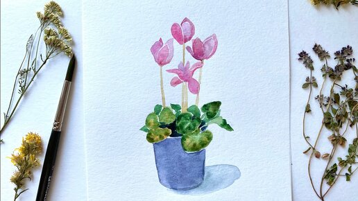 Рисуем весенний Цикламен в горшке. Урок рисования акварелью для начинающих