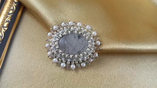 Брошь вышитая бисером с белым агатом и жемчугом, авторская, art b7