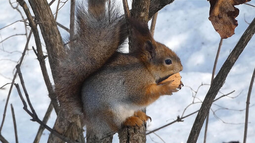 Белочка съела грецкий орех и радостно бегает по веткам.