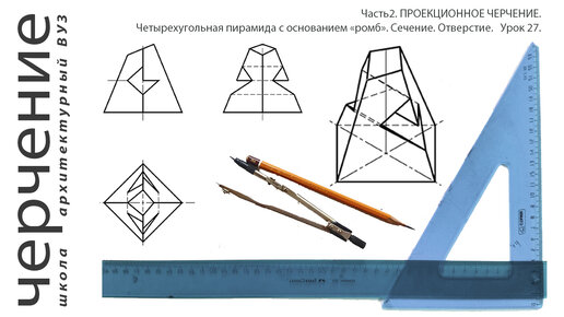 Четырехугольная пирамида с основанием"ромб".Сечение.Отверстие.Урок27. (ПРОЕКЦИОННОЕ ЧЕРЧЕНИЕ)