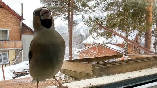 Такое увидишь не часто. Как наглая птица дубонос рвётся в квартиру.