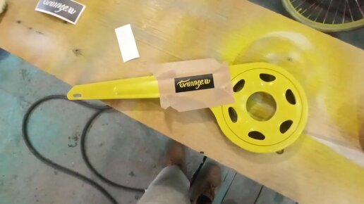 Полная покраска велосипеда в жёлтый цвет с перламутром.