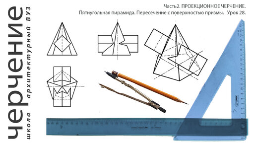 Пятиугольная пирамида. Пересечение с поверхностью призмы. Урок 28.(ПРОЕКЦИОННОЕ ЧЕРЧЕНИЕ)