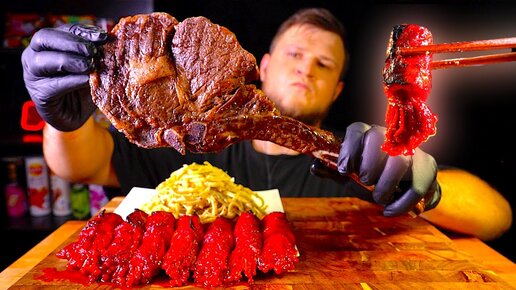 Стейк томагавк, грибы эноки, паста песо. ASMR MUKBANG, АСМР МУКБАНГ