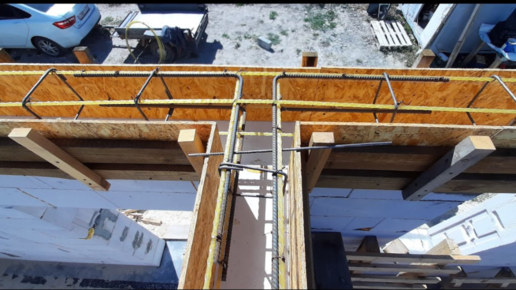 22. Опалубка для армопояса из ОСБ. Армокаркас из стеклопластиковой арматуры.Зали