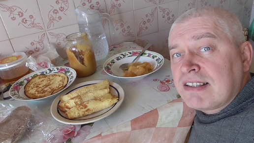 Блины на тарелке и яблочное повидло на тарелке. Так я кушаю блины