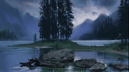 Нарисовал красивый горный пейзаж с камнями и деревьями