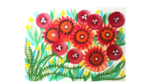 Как нарисовать красные цветы гуашью, круглой кистью-губкой и ватными палочками.